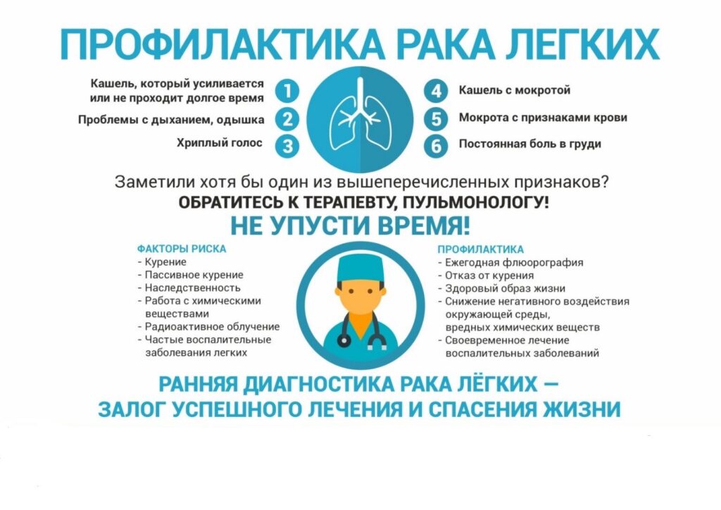 Заключение: Профилактика рака лёгких направлена на снижение негативного воздействия опасных факторов на здоровье или их полное исключение. Своевременная диагностика, укрепление защитных сил организма, отказ от пагубных привычек помогут избежать развития опасной патологии органов дыхания.