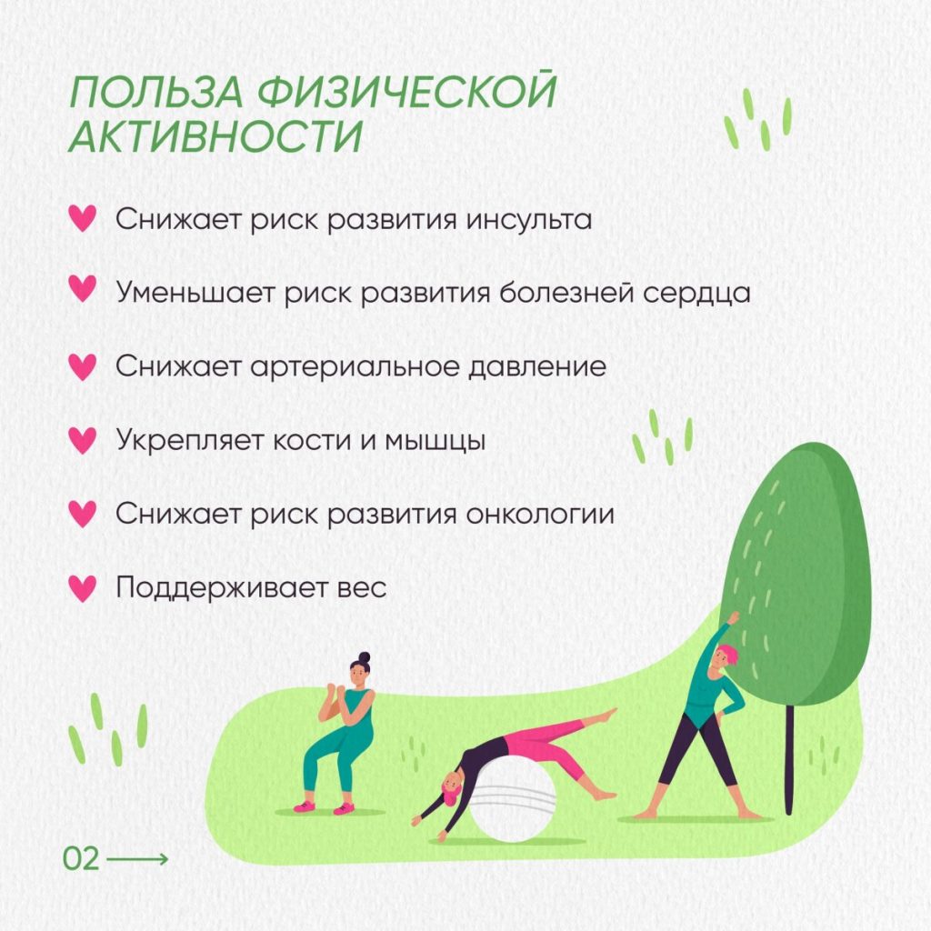 Регулярная физическая активность жизненно важна, так как она укрепляет сердце и сосуды, помогает контролировать вес, снижает риск диабета, рака и сердечно-сосудистых заболеваний, а также значительно улучшает психическое здоровье, снимает стресс, борется с депрессией, улучшает сон, повышает самооценку, укрепляет кости и мышцы, и в целом продлевает жизнь, улучшая ее качество.