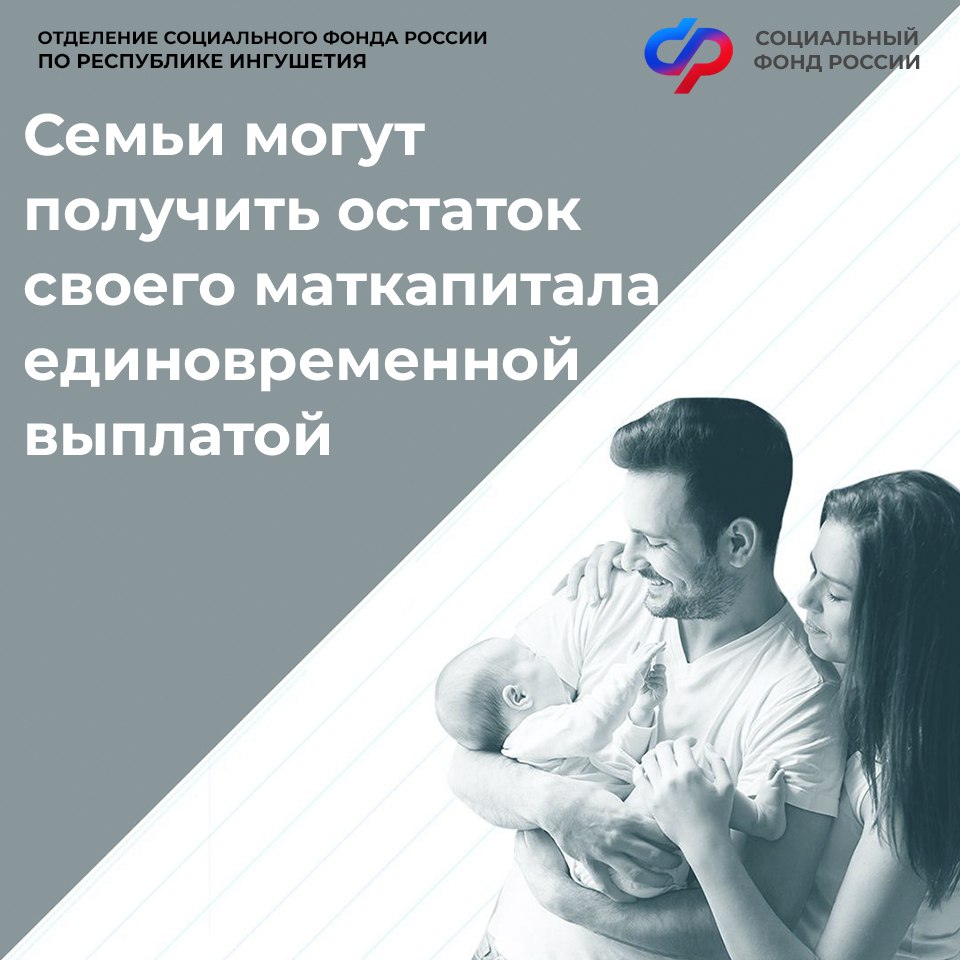 Семьи, у которых на сертификате материнского капитала осталось 10 тысяч рублей или меньше, могут получить эти средства в виде единовременной выплаты. По данным Отделения СФР по Республике Ингушетия, с момента реализации программы такой возможностью воспользовались более 400 семей региона.