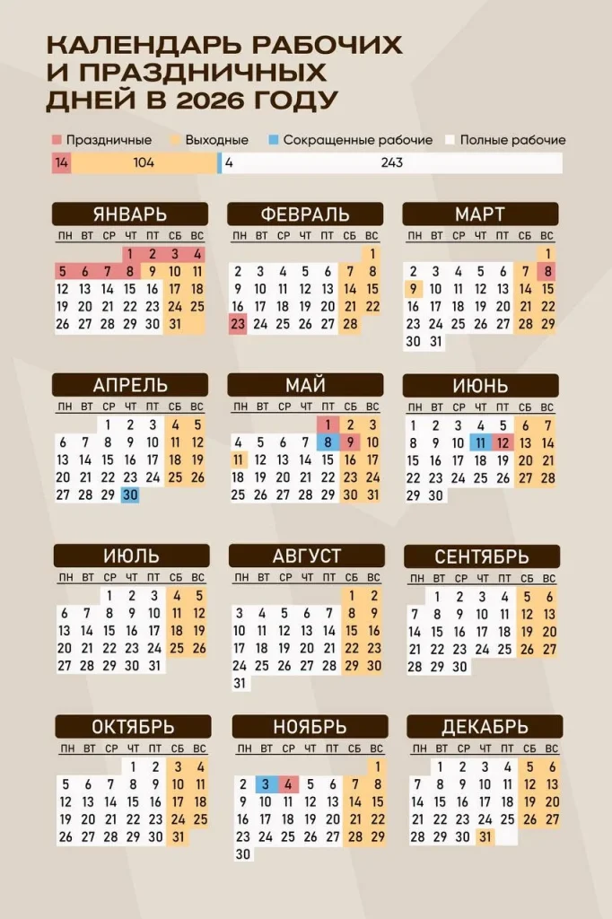 Новости В 2026 у россиян не будет шестидневных рабочих недель От polzovatel - 29 декабря, 2025 WhatsAppEmailTelegramVKCopy URL В 2026 у россиян не будет шестидневных рабочих недель. Следующая шестидневка запланирована лишь на 2027 год.